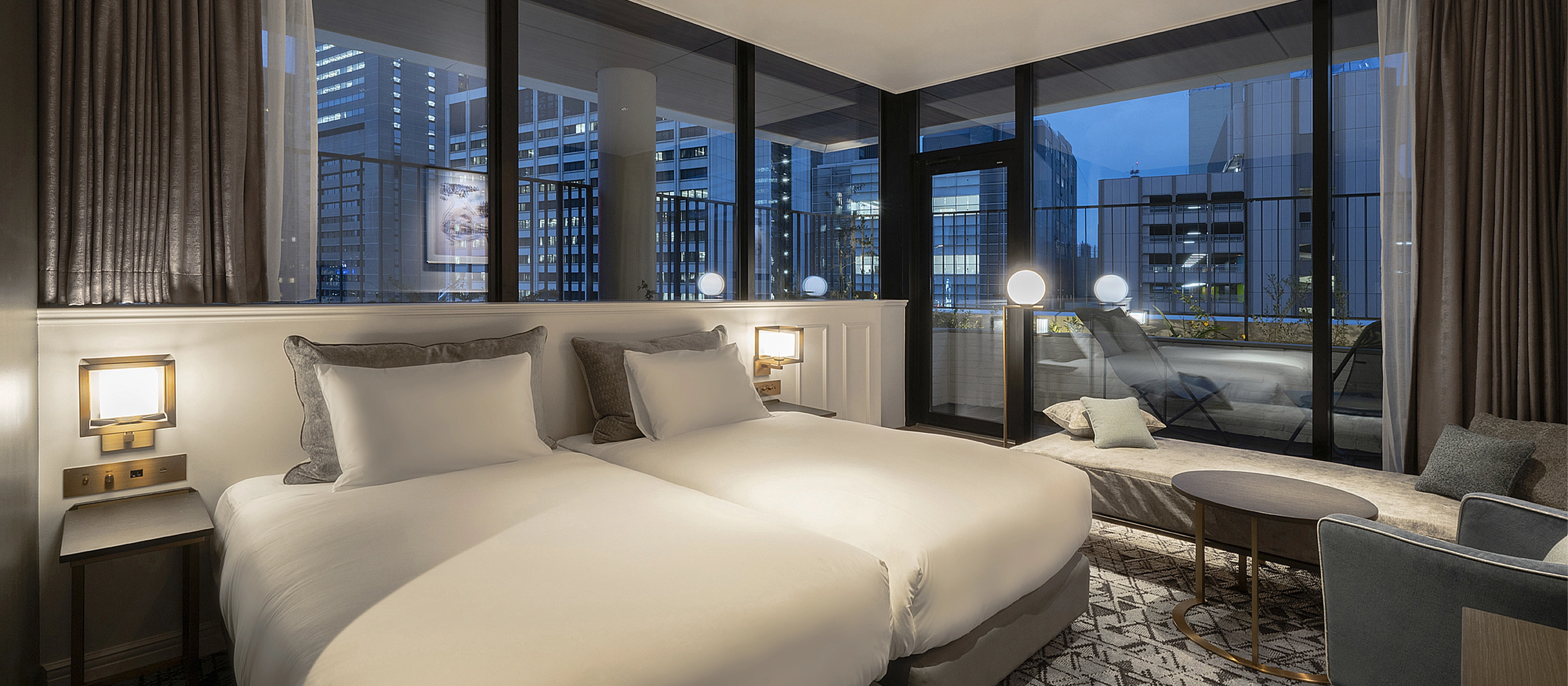 以銀座的熱鬧為背景,前往酒店的入口。乘坐電梯到達5樓的前臺,優質且安靜的空間展現在眼前。