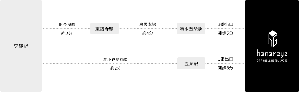 ・從JR“京都站”到“五條站”乘坐地鐵烏丸線約2分鐘,從“五條站”1號出口徒步8分鐘
