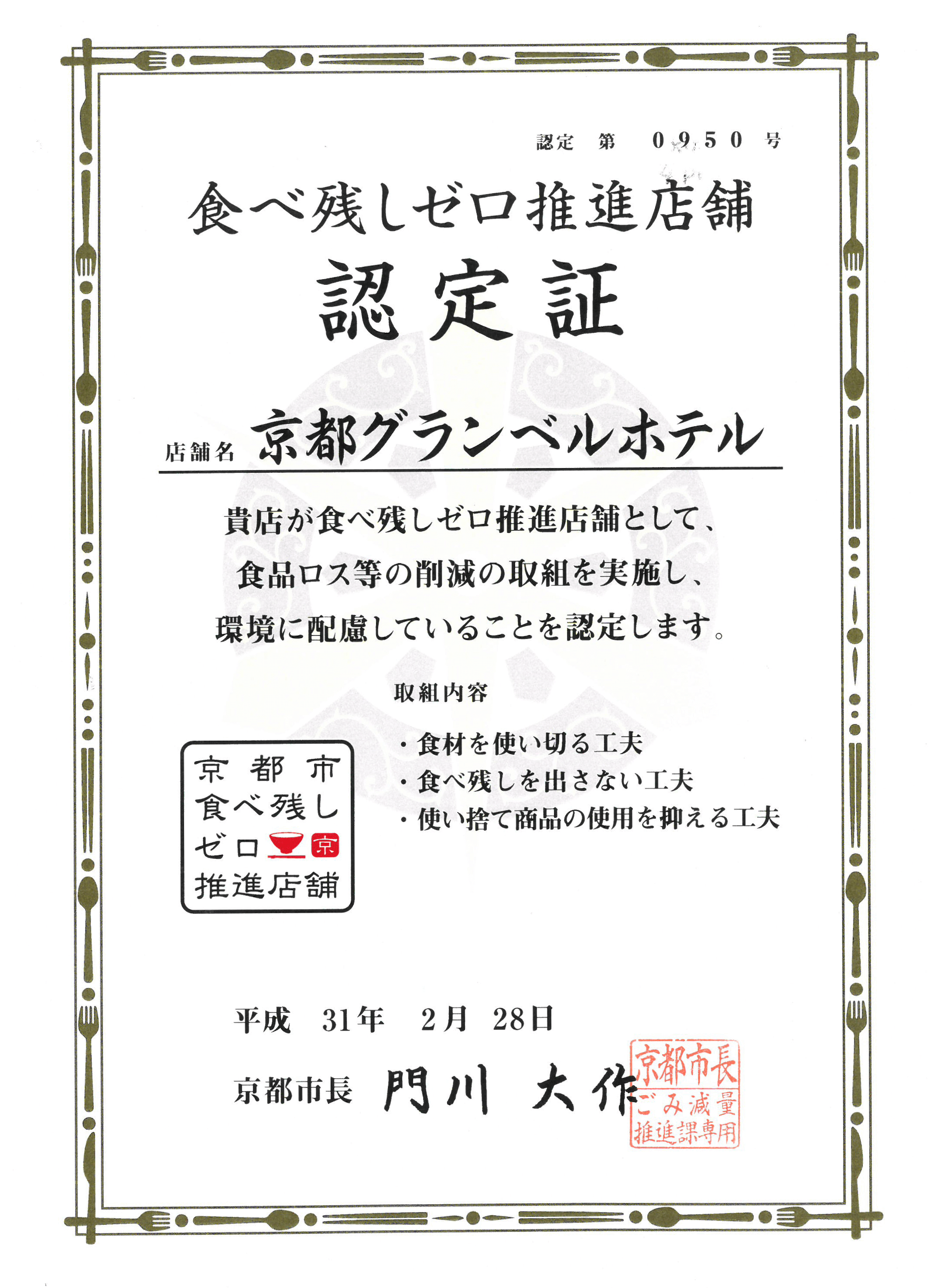 GRANBELL HOTEL KYOTO因其在減少食物浪費方面所做的努力而受到認可,並被京都市認證為「零食物浪費推廣店」。