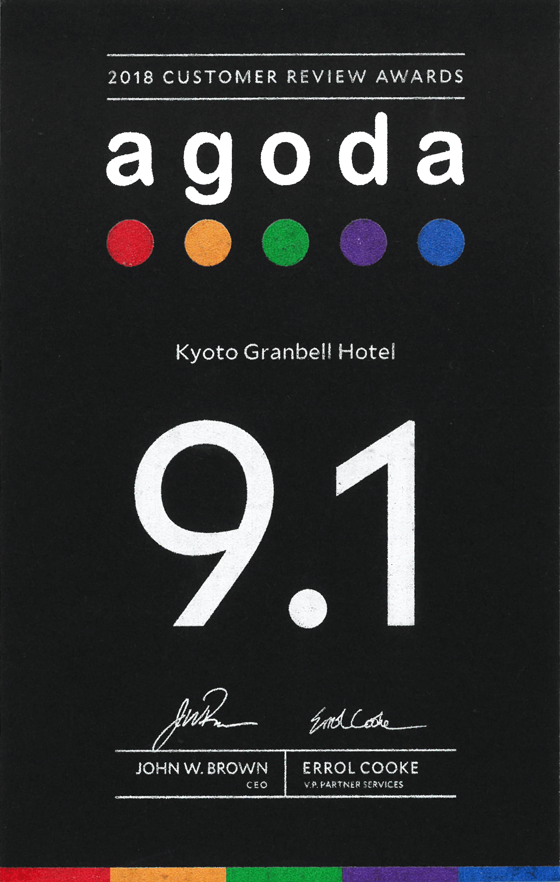 GRANBELL HOTEL KYOTO榮獲 Agoda.com 頒發的 2018 年度客戶評價獎,Agoda.com 是一家處理世界各地酒店的亞洲主要酒店預訂網站。