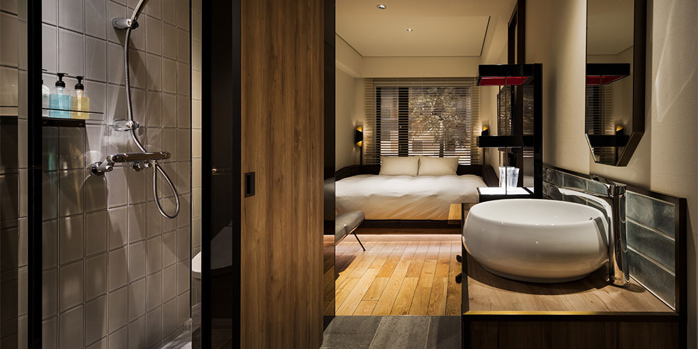 另外,地下的房間配有格子花紋的瓷磚牆壁和植物被燈光照亮的寬敞的院內庭園,在日式情調中發揮地下的優點的安靜的房間裡能舒適地放松。