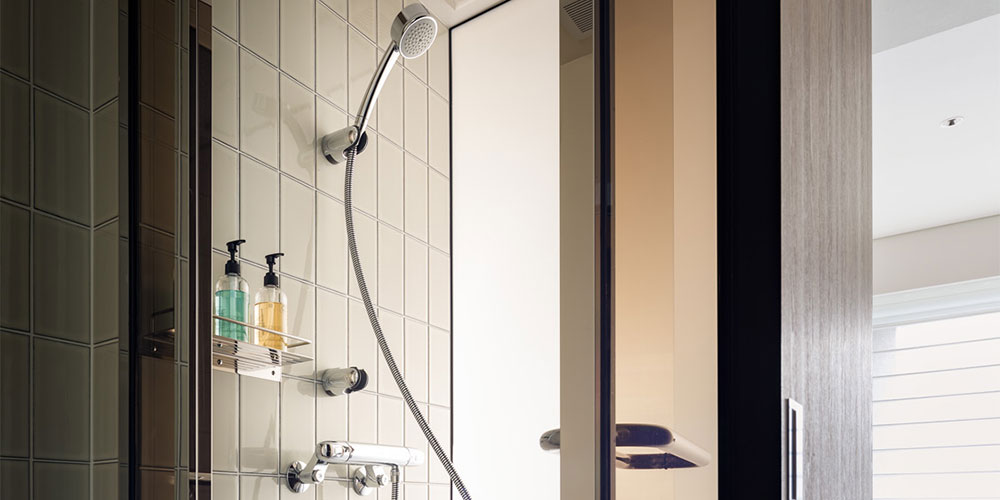 面向房間的霜狀玻璃淋浴室有如行燈般明亮,讓您在柔和的光線中舒適放松。