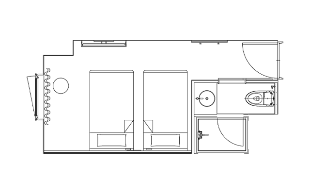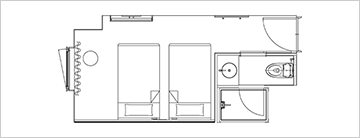 適用於觀光、商務及其他私人住宿。簡單實用的雙床房可適用於各種場合。床下的空間可用來存放行李箱等。
