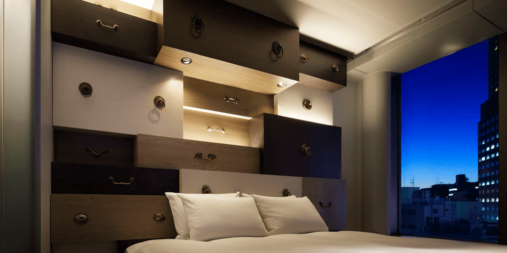 抽屜的房間。具有照明,架子,床等各種功能的抽屜佈置在整個牆壁上。