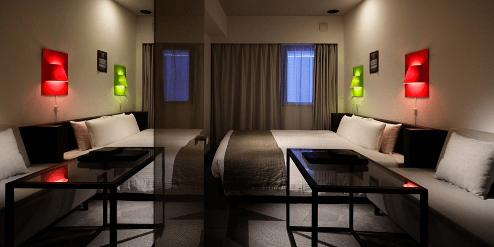 海報的房間。在單調的空間中,以海報為主題佈置彩色照明和相框。